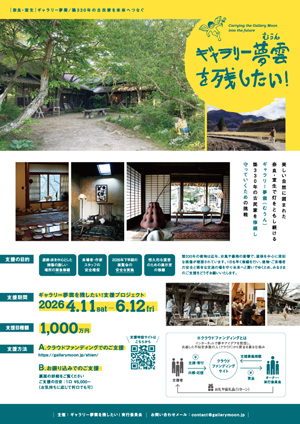 奈良・室生/ギャラリー夢雲 築330年の古民家を修繕し、未来へつなぐ。 奈良・室生の地で27年間、 手仕事とアートの灯をともし続けてきたこの場所が、 建物の老朽化のため、存続の岐路に立っています。 この灯を消さず、次の世代へと繋ぐために、 皆さまのお力をお貸しいただけないでしょうか。 2026年4月11日、クラウドファンディングがスタートしました。 ギャラリー夢雲を残したい!ホームページにて 詳しくご案内しています。